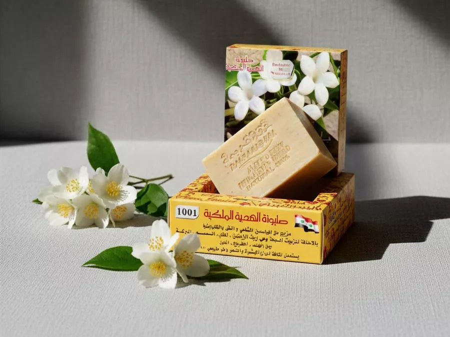 صابون حلب بالياسمين الشامي ، تحيةٌ للتقاليد السورية وعذوبة الزهور الشرقية. صُنع هذا الصابون الطبيعي على طريقة حلب العريقة، وهو غنيٌّ برائحة الياسمين الدمشقي الرقيقة، رمز النقاء والجمال في الثقافة الشامية.