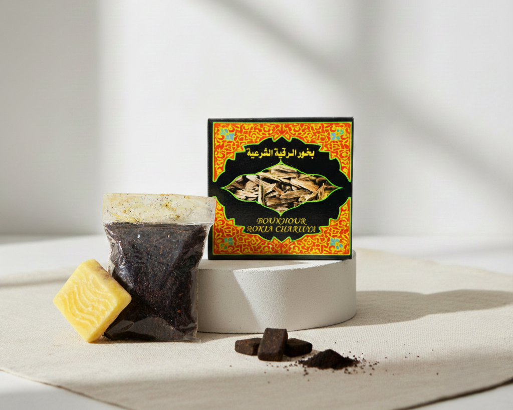 Le Bakhour Rouquia (بخور الرقية) est un encens traditionnel unique, utilisé depuis des siècles dans les rituels de purification spirituelle et de protection. Composé d’un mélange soigneusement élaboré d’herbes, résines et essences naturelles, il s’inspire des recettes ancestrales transmises de génération en génération.
